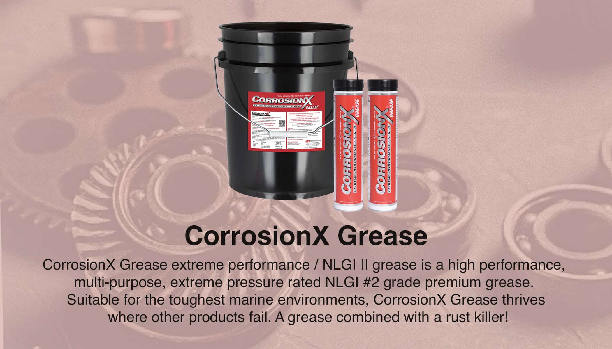 CorrosionX Grease extreme performance / NLGI II grease is a high performance, multi-purpose, extreme pressure rated NLGI #2 grade premium grease. Suitable for the toughest marine environments, CorrosionX Grease thrives where other products fail. A grease combined with a rust killer. Engineered for maximum shear stability, film strength and heavy shock-load performance, CorrosionX Grease offers unsurpassed wear and extreme pressure protection. Premium base oils provide proven oxidation resistance, unsurpassed performance in marine and freshwater environments. Over-based calcium sultanate complex thickener maximizes pumpability, water resistance and high dropping point of 286 degrees C. Superior anti-wear additives lubricate and prevent wear. Synergistic corrosion inhibitors protect against rust and corrosion. Advanced extreme pressure additive package handles high carrying and shock loads. CorrosionX Grease is used to lubricate the wire ropes on container cranes at all New Zealand’s major ports because it extends the life of the wires. CorrosionX grease sticks to the crane wires at a molecular level, so our grease provides long lasting lubrication and corrosion protection and will not flick off and block critical sensors.