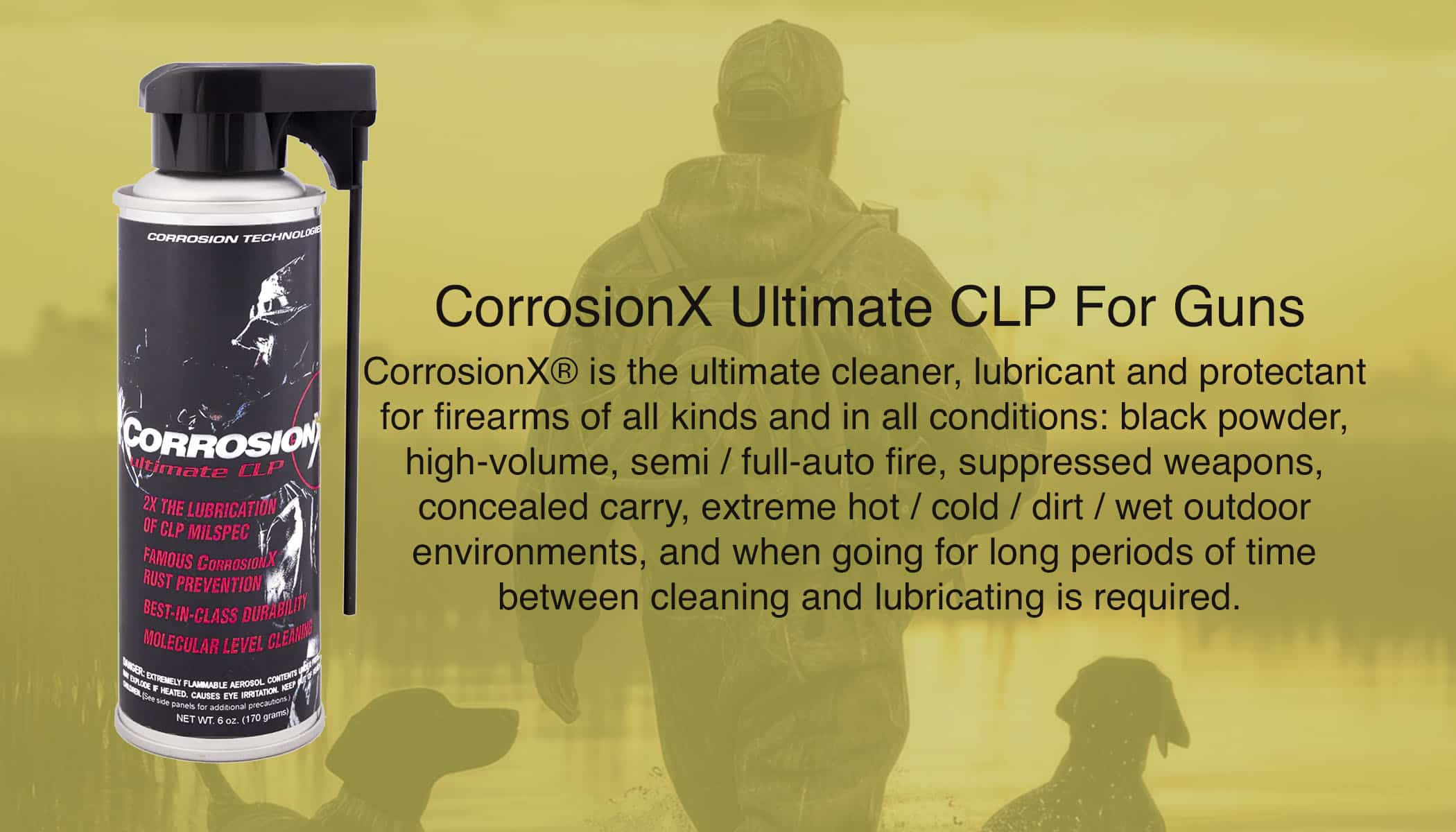 CorrosionX® is the ultimate cleaner, lubricant and protectant for firearms of all kinds and in all conditions: black powder, high-volume semi / full-auto fire, suppressed weapons, concealed carry, extreme hot / cold / dirt / wet outdoor environments, and when going for long periods of time between cleaning and lubricating is required.
