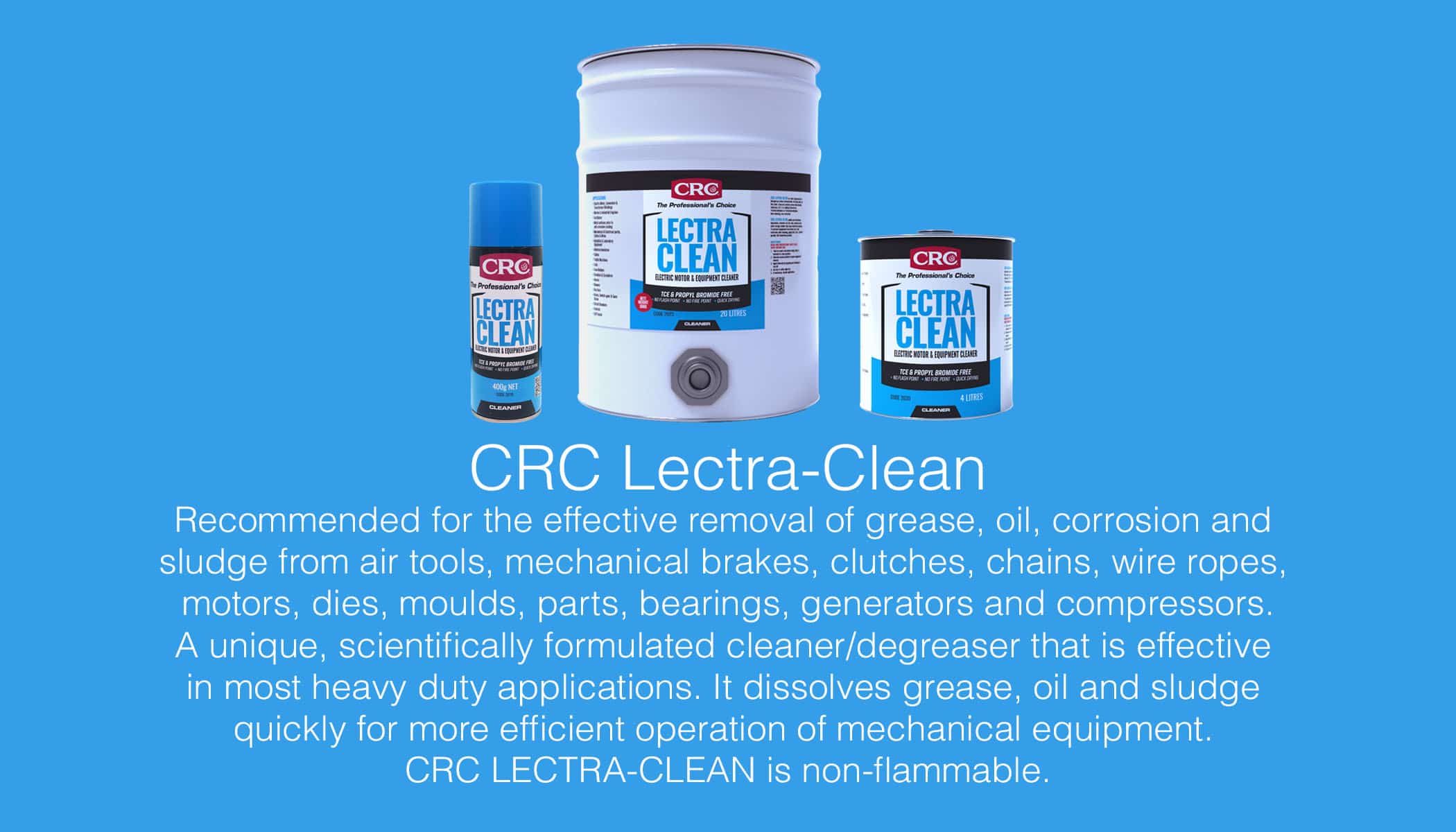 CRC Lectra-Clean Liquid – 400g   CRC Lectra-Clean Liquid – containing no Trichloroethylene is a unique, scientifically formulated cleaner/degreaser that is effective in most heavy duty applications. It dissolves grease, oil and sludge quickly for more efficient operation of mechanical equipment. Lectra Clean Liquid is non-flammable.   APPLICATIONS Recommended for the effective removal of grease, oil, corrosion and sludge from air tools, mechanical brakes, clutches, chains, wire ropes, motors, dies, moulds, parts, bearings, generators and compressors.   FEATURES/BENEFITS No flash or fire point – significantly reduces the risk of fire caused by incidental contact with live electrical equipment or solvents…