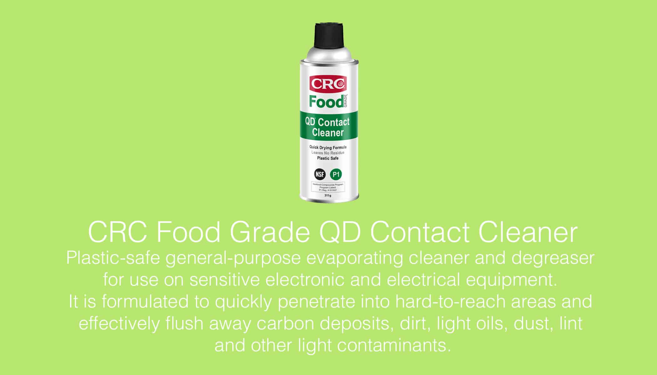 CRC QD Contact Cleaner is a plastic-safe general-purpose evaporating cleaner and degreaser for use on sensitive electronic and electrical equipment. It is formulated to quickly penetrate into hard-to-reach areas and effectively flush away carbon deposits, dirt, light oils, dust, lint and other light contaminants. Suitable for cleaning sensitive electronics and electrical equipment without leaving a residue. Evaporates quickly, leaves no residue and is safe to use on all plastics. Use where lower flashpoint cleaners are acceptable. NSF P1& K2 Registered.