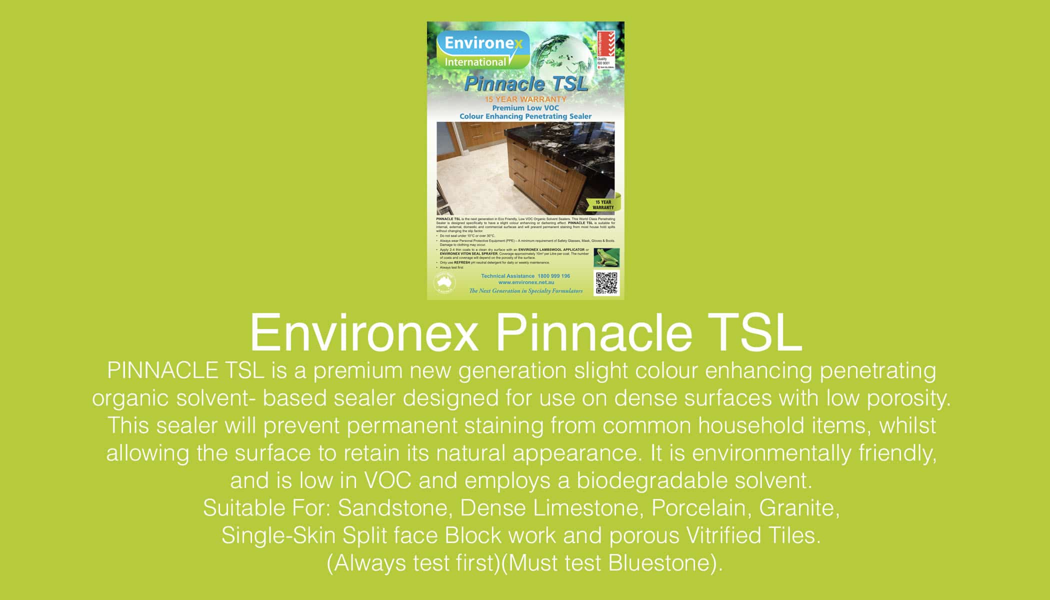 Environex Pinnacle TSL Penetrating Sealer is a premium new generation slight colour enhancing penetrating organic solvent- based sealer designed for use on dense surfaces with low porosity. This sealer will prevent permanent staining from common household items, whilst allowing the surface to retain its natural appearance.