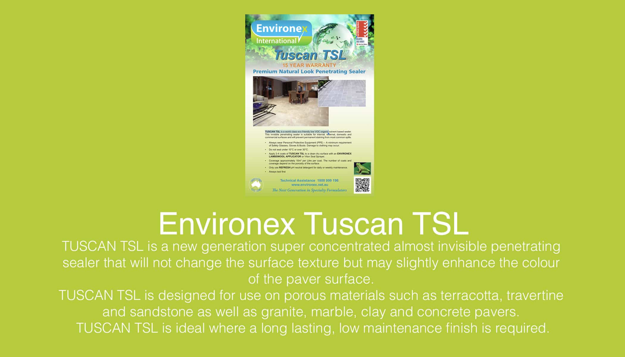 • Allow a minimum of 14 days from date of laying/grouting of newly laid pavers or stone surfaces before application of Environex Tuscan TSL Sealer to ensure all moisture has left grout and substrate.