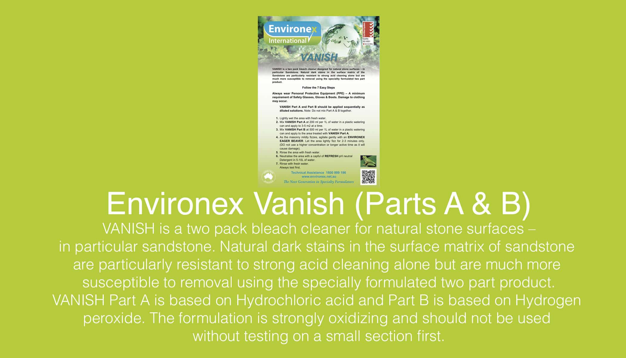 Environex Vanish Cleaner is a two pack bleach cleaner for natural stone surfaces – in particular sandstone. Natural dark stains in the surface matrix of sandstone are particularly resistant to strong acid cleaning alone but are much more susceptible to removal using the specially formulated two part product.