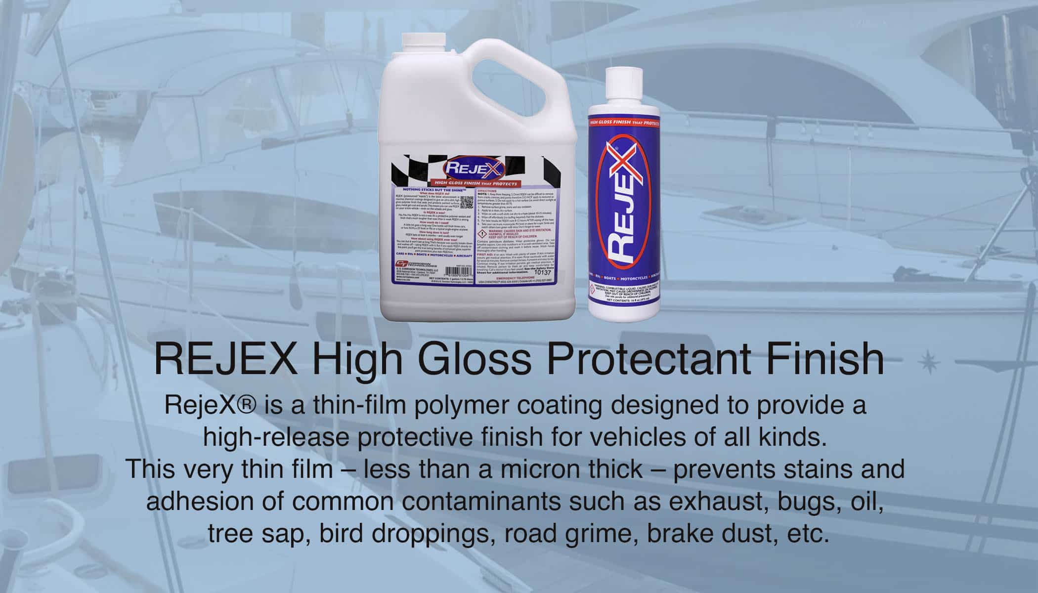 REJEX High Gloss Protectant Finish protects and beautifies painted metal, glass, acrylic, gel coat, fiberglass, glossy plastic & polished metal surfaces.