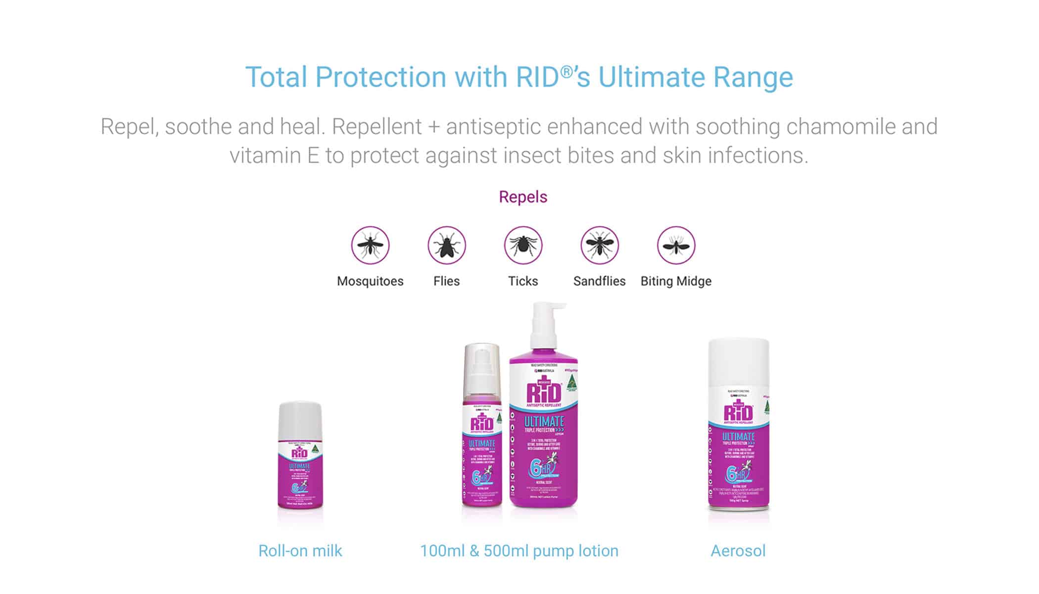 Rid Ultimate Strength Lotion PLUS Antiseptic Pump 100ml • Rid Ultimate Strength Lotion PLUS Antiseptic Pump 100ml contains 16% DEET – effectively repels for up to 6 hours. • Antiseptic reduces inflammation and assists to prevent infection caused by insect bites. • Designed to be applied as a FIRST AID as a BEFORE and AFTER bite medication. • Chamomile helps soothe a bite to stop the itching. • Vitamin E assists in wound healing of broken skin. • Combined with a fly repellent effective against flies, gnats, tsetse flies, ants and lice. • No touch application in handy size bottle…