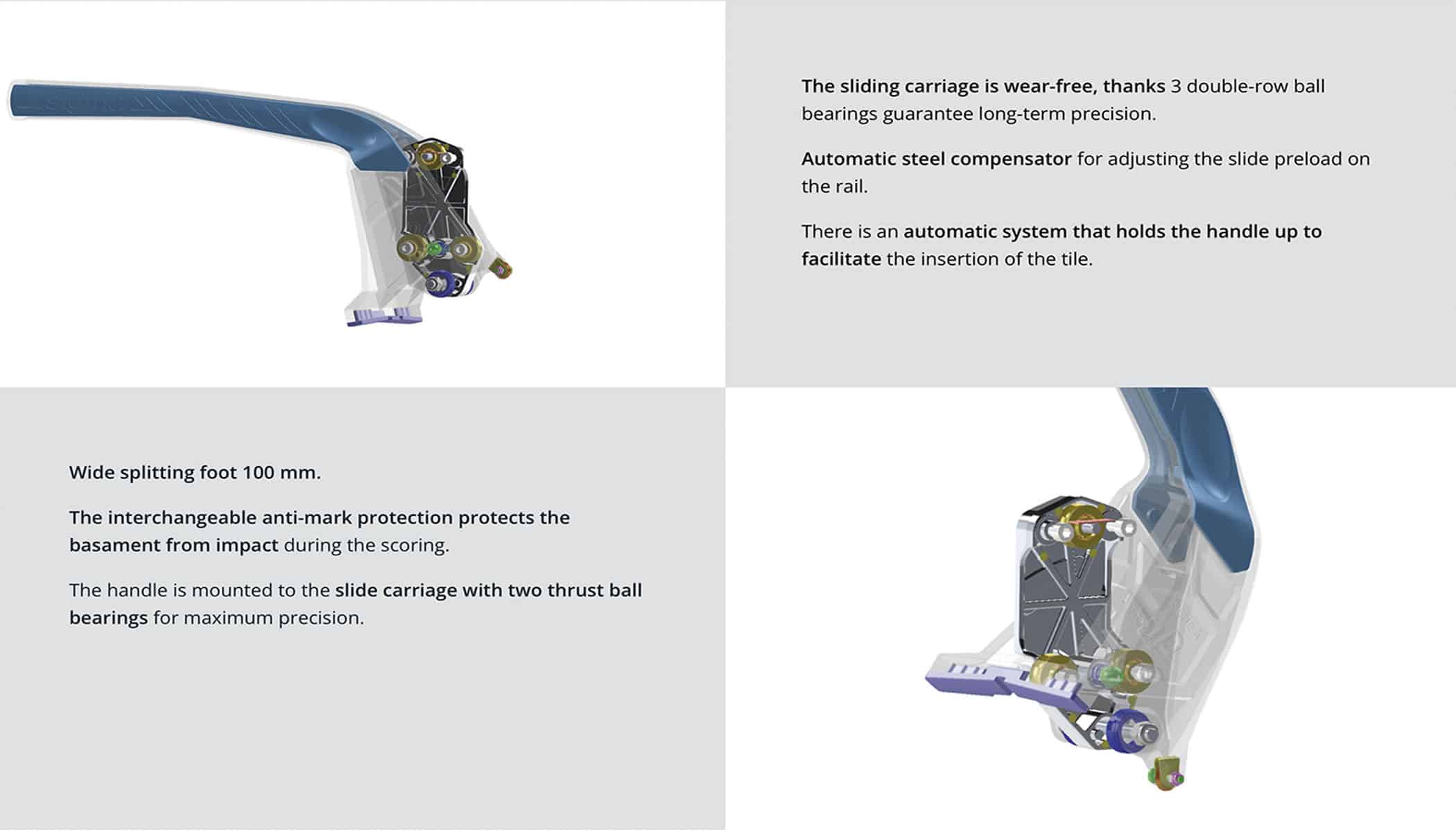 • The sliding carriage of the handle is wear-free thanks to 3 double crown ball bearings that guarantee precision over time, without the need for maintenance
