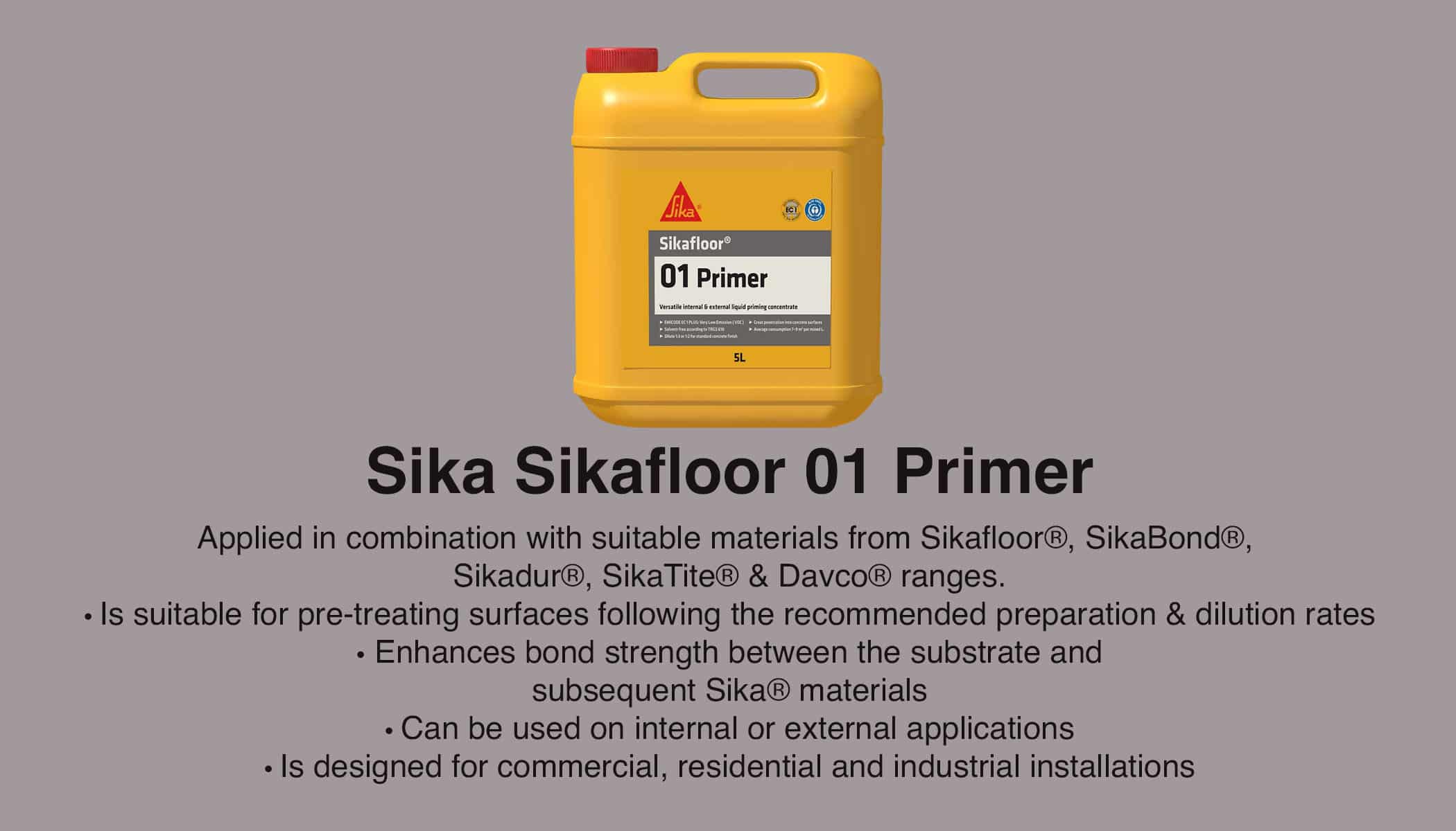 Sikafloor 01 Primer is a concentrated resin primer designed to be applied prior to the application of cement and gypsum type products.