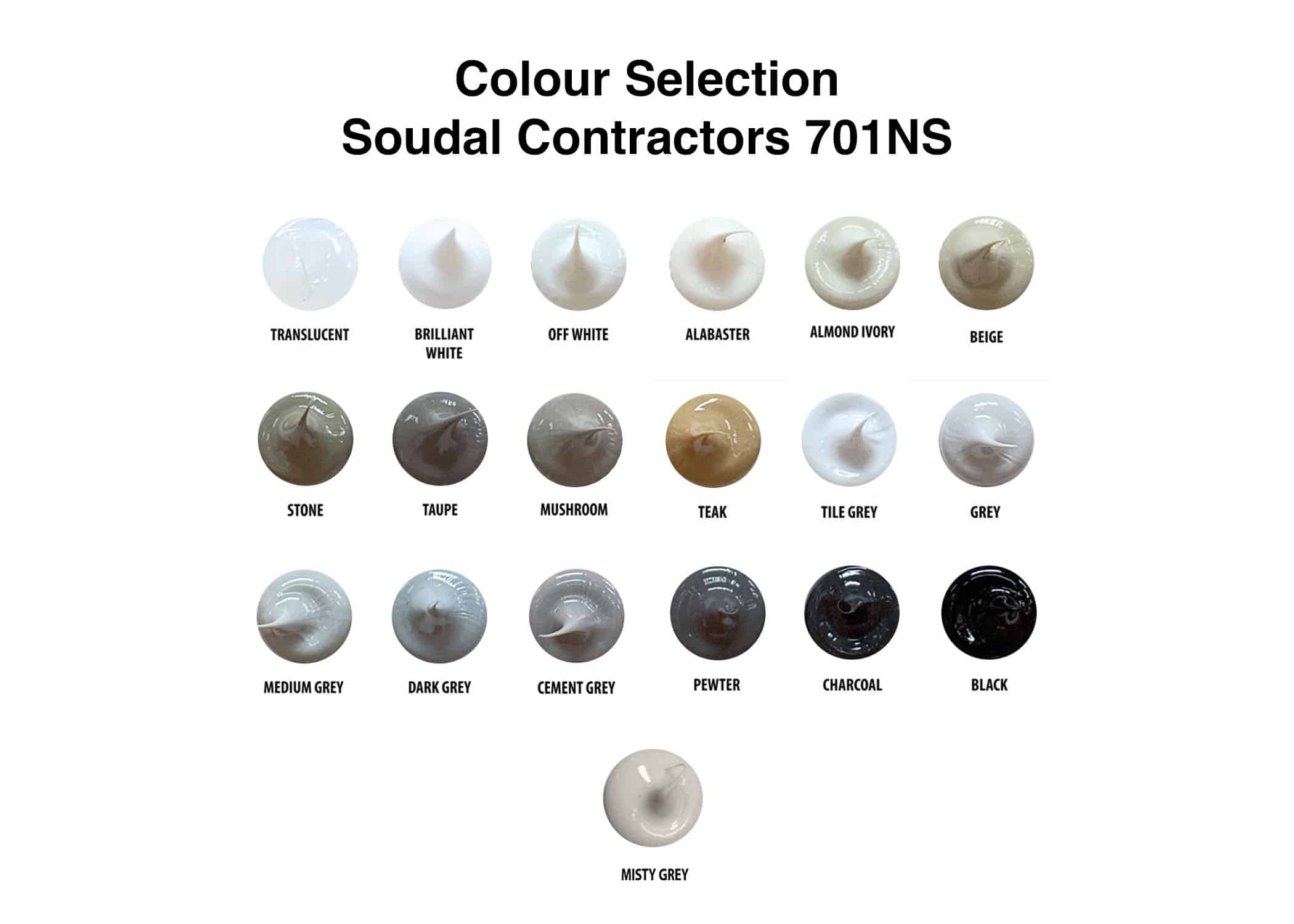 Soudal Contractors 701 NS Silicone is a high-performing, low modulus, neutral cure sanitary silicone that is virtually odourless and no M.E.K.O. Highly flexible, colourfast and suitable for a wide range of applications that requires a waterproof seal where a maximum protection against mould and mildew is required
