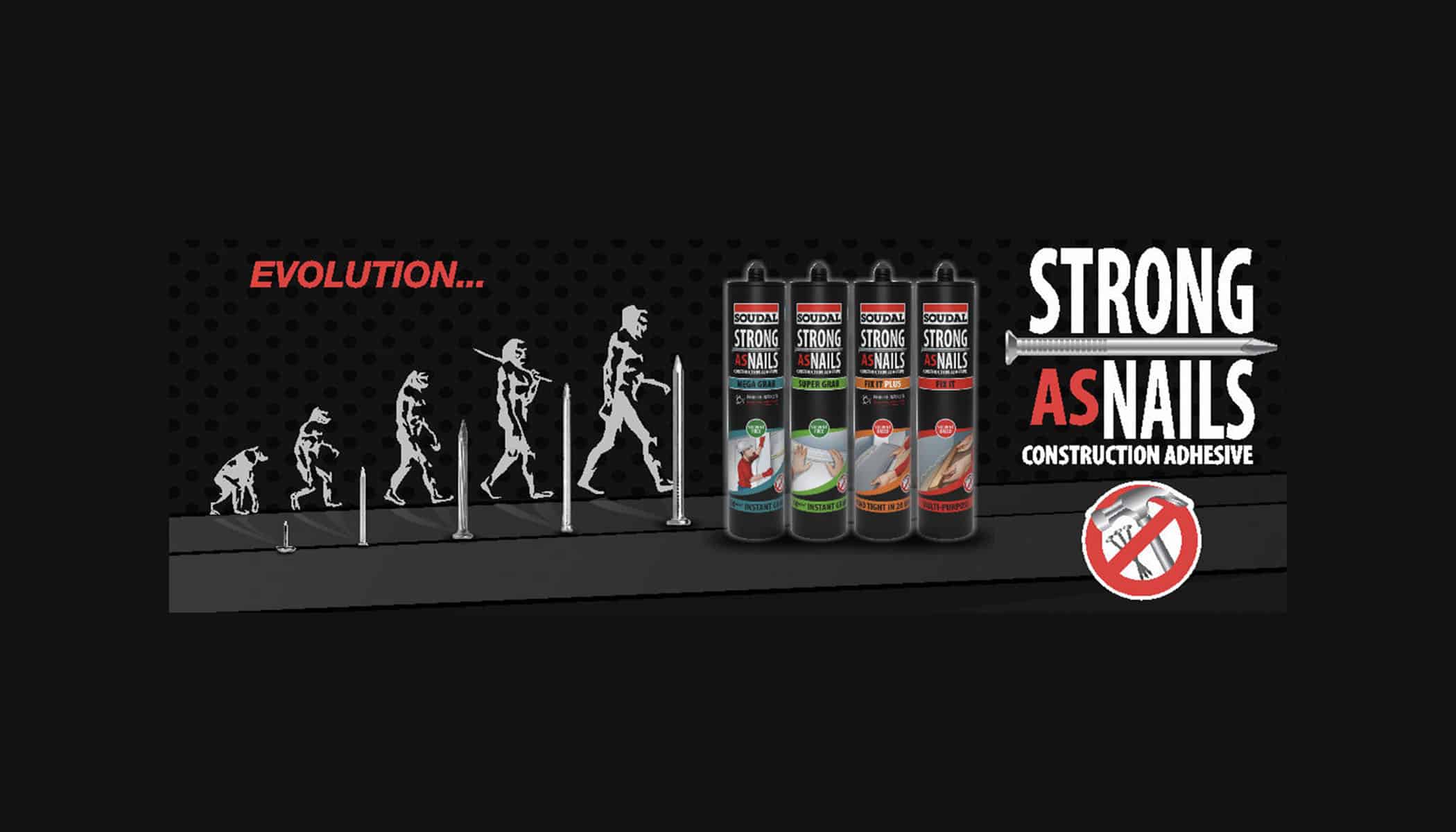 Soudal Strong as Nails Fix It is a Solvent based high performance, gap filling construction adhesive. High bond strength. Suitable for vertical and horizontal bonding applications, both inside and outside. Does not attack Polystyrene. Suitable for bonding of two non-porous substrates (use transfer method).