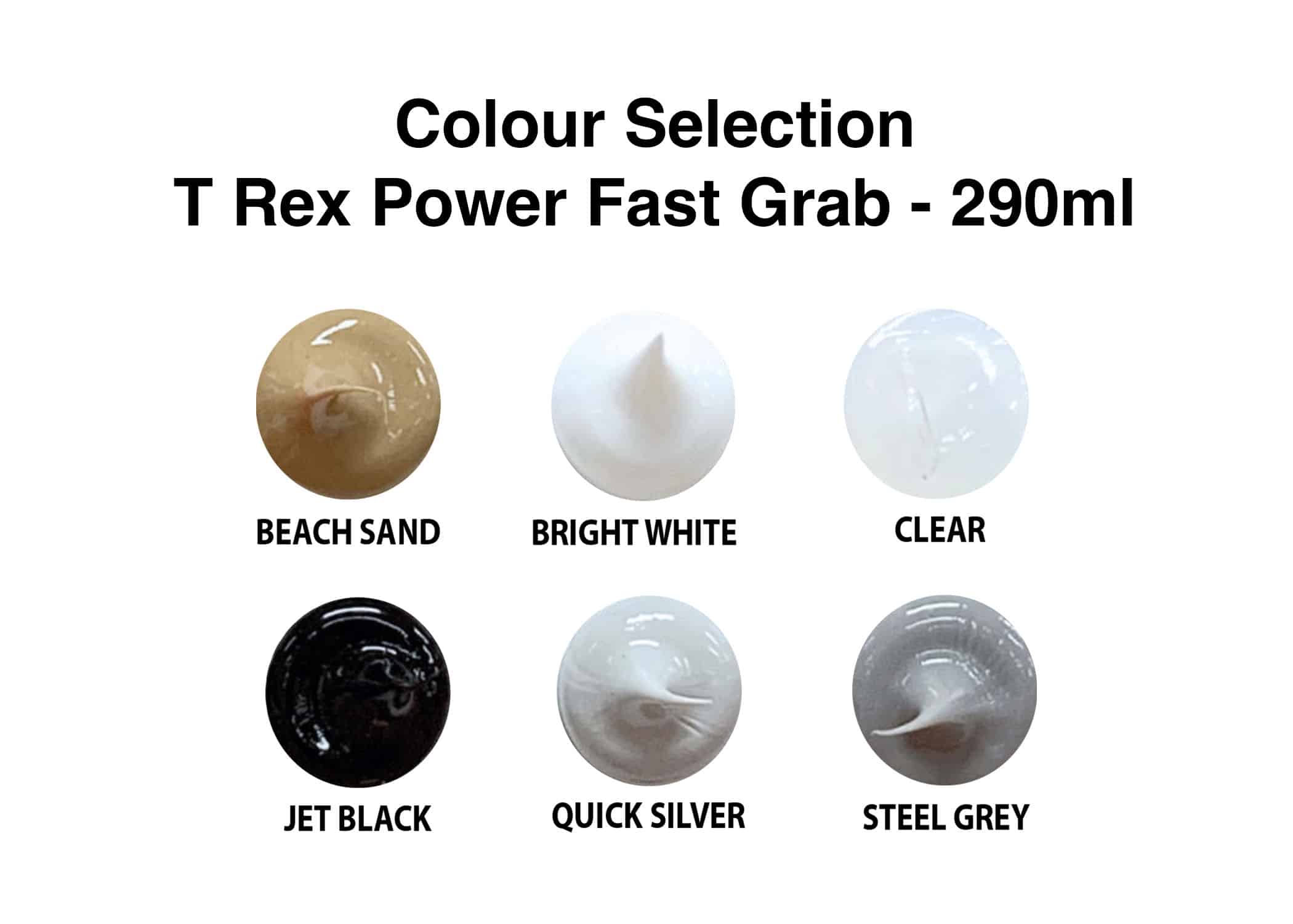 Soudal T Rex Power Fast Grab Adhesive Is available in a 290 ml cartridge, in white, black, grey, quick silver, beach sand. It is available as a 600ml sausage in white. Other colours are available on request.