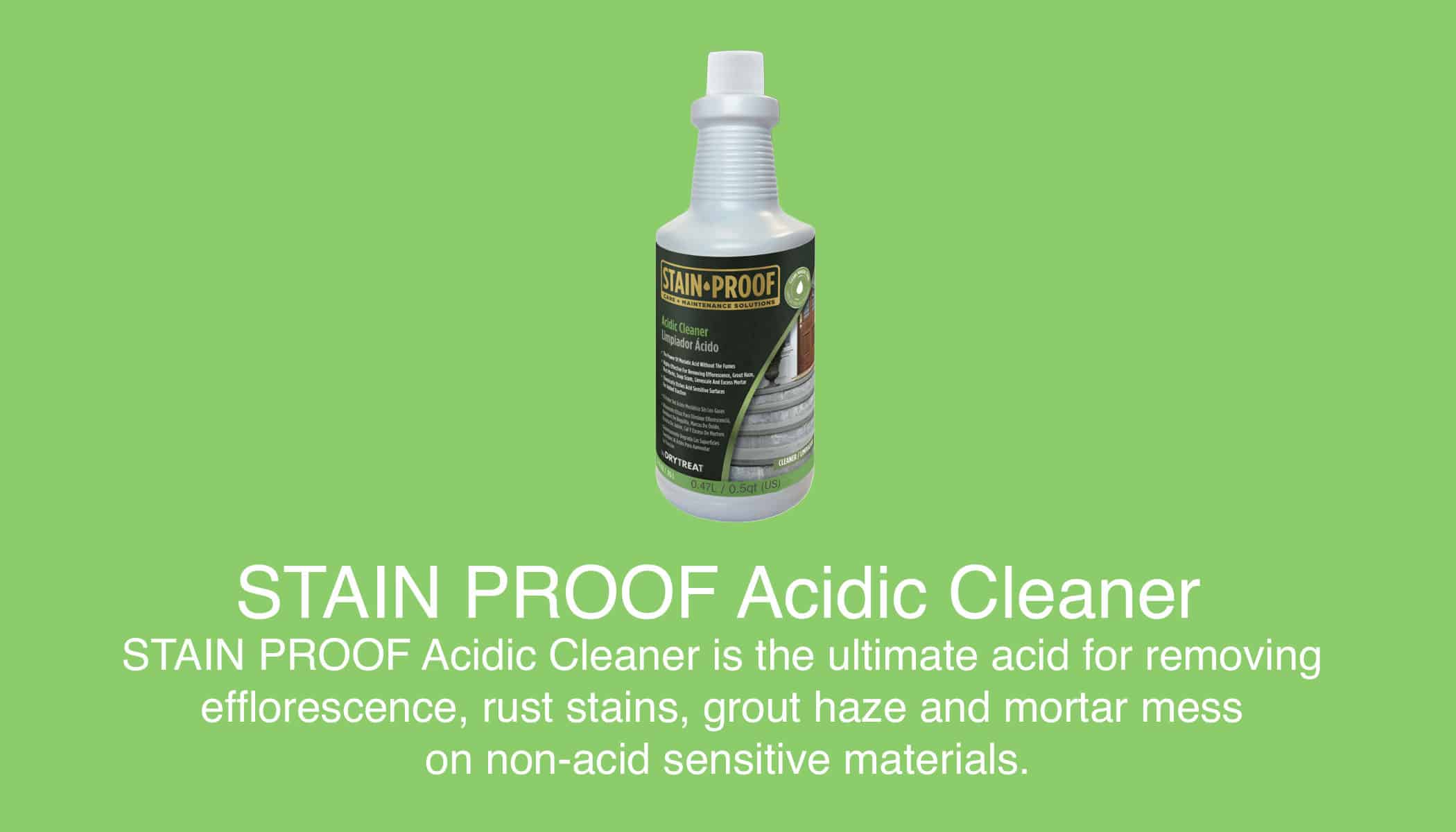 STAIN PROOF Acidic Cleaner is the ultimate acid for removing efflorescence, rust stains, grout haze and mortar mess on non-acid sensitive materials.