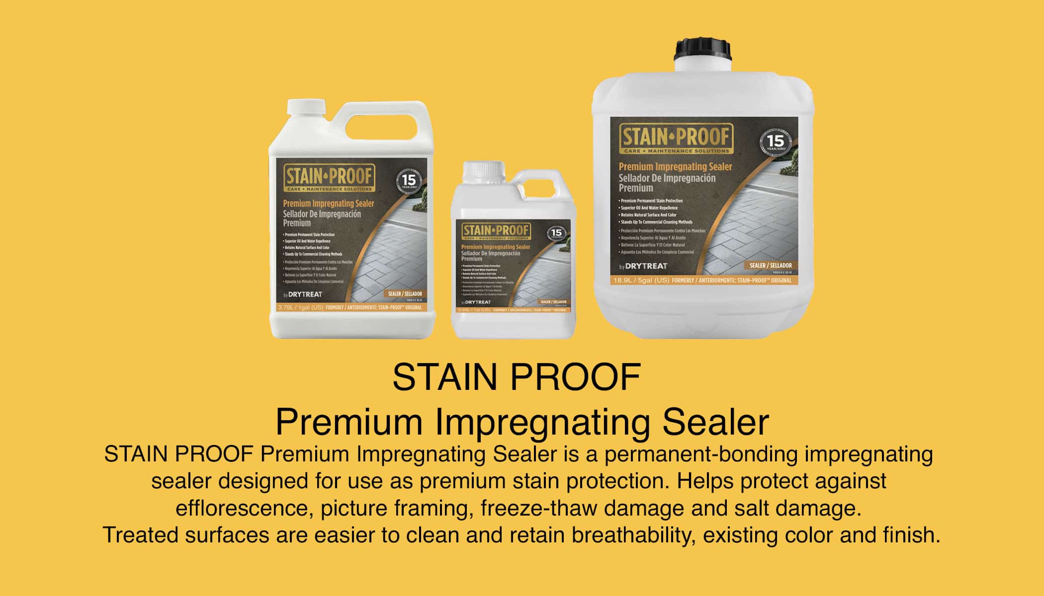 STAIN PROOF Premium Impregnating Sealer is a permanent-bonding impregnating sealer designed for use as premium stain protection. Helps protect against efflorescence, picture framing, freeze-thaw damage and salt damage. Treated surfaces are easier to clean and retain breathability, existing color and finish. For indoor, outdoor, residential and commercial use.